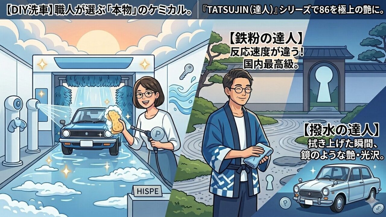 今回は、私が「職人の目」で選び抜いた、プロユーズのクオリティを自宅で実現できる洗車・コーティング剤、HISPE(ハイスペ)の「TATSUJIN(達人)」シリーズをご紹介します。