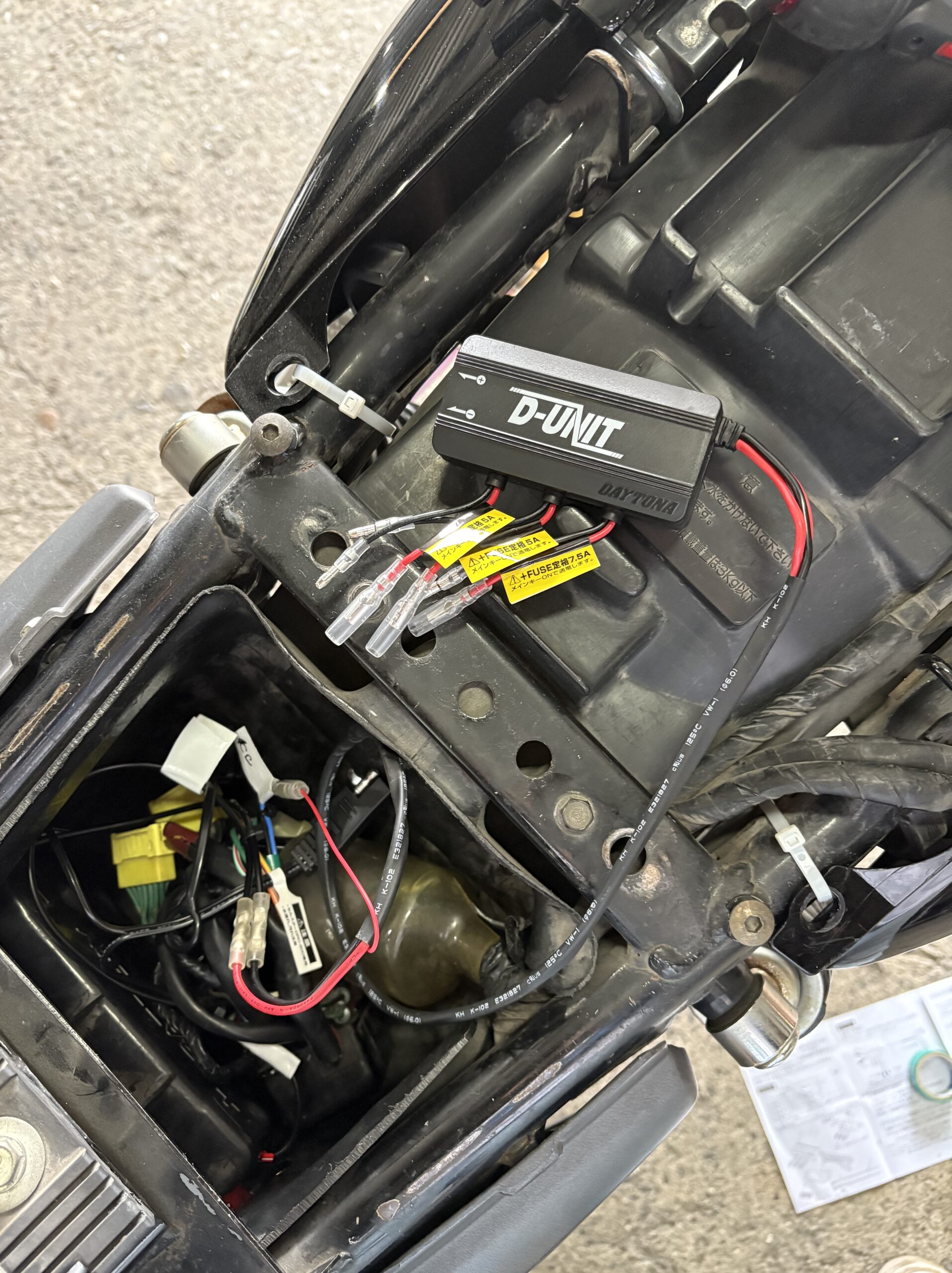 - デイトナ D-UNITの取り付け:バッテリー直結のリレー付き電源ユニット。これで複数の電装品に安定したACC電源を供給できます。タンク下のスペースにスマートに設置。